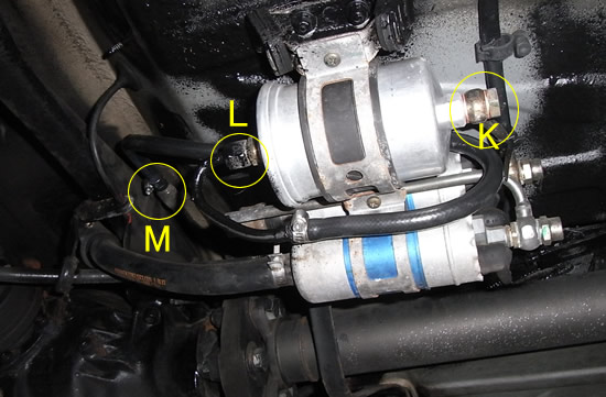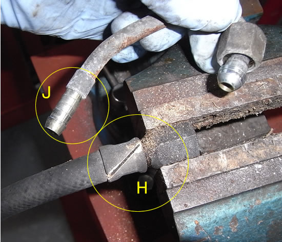 燃料 フルターとAのホースはナットを緩め外しました。Hのようにカシメを切り古いホースを抜き