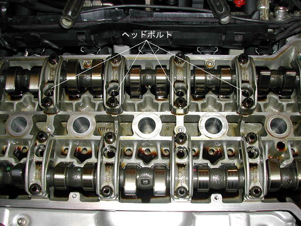 ちょっと拡大 カムシャフトのベアリングに穴があり カムシャフトを外さなくてヘッドボルト締め付けは可能
