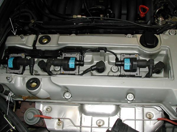 掃除してきれいになったヘッドカバーを載せ規定トルクで締めて終了。ヘッドカバー後方からもオイルが滲みやすいので矢印部分はちょっと強めに締めた。これでどの程度ヘッドガスケットからのにじみが止まるか観察してみます。