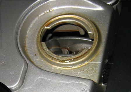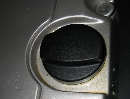 数日後点検するとフィーラーキャップからオイルのにじみを発見! 今回の作業前はほとんど無かったのに・・・ |