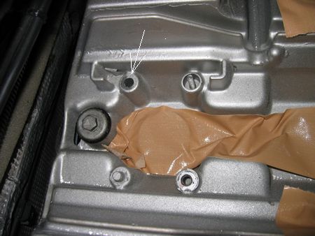 矢印:これから修正するネジ穴・・・リコイル使うため下穴6.3mmのドリルで深さ30mm空けました。 右下のネジ穴に銀色の粉末が詰まっているのが見えます。(大丈夫だった4箇所は)穴の中をホジホジしエアーガンで吹きM6のタップを慎重に通しました。 |