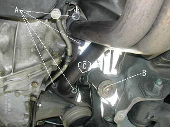 アンダーカバー外してからヒートシールド2面幅10mmボルト2本緩めて外します。次に Aはエキゾーストパイプ > センターマフラー固定ボルト。2面幅13mmエクステンションを使い緩めます。 Bはアイドラーアームナット 2面幅24mmボルトも同じく24mm。 Cのパイプにボルトが当たり上に抜けないので苦労します。 |