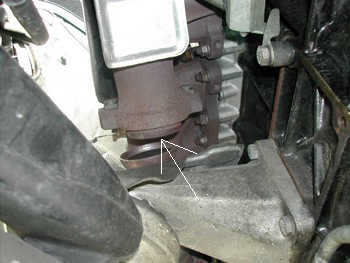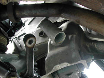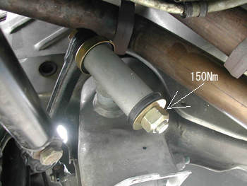 2009.10.6追記:LHDでもE500/500Eでもマフラーを外す必要はありませんでした。 この作業でボルトが上に抜けない場合エンジンマウントがつぶれている可能性があります。LHD車の場合右側のエンジンマウント上側のボルトを外しエンジン全体をジャッキ等で持ち上げれば数センチ間隔で隙間を作ることが出来ます。 |