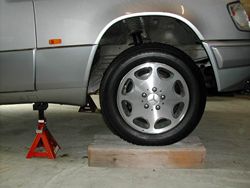坂道をまだ作っていないのでジャッキアップ後タイヤの下に角材を置いて安全を確保します。Pブレーキしっかりかけてリヤタイヤにも歯止めをします。 |