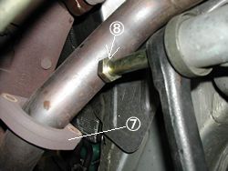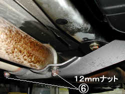 Eセンターマフラーのマウント12mmのレンチで外す。これ以降はラバーで吊ってあるだけなのでゆするとグラグラするのですが・・。 |