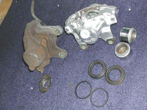 キャリパーとリペアキット(ヒートシールドも付いてくる) ヒートシールドも左右ありピストンの組み込みには注意が必要です