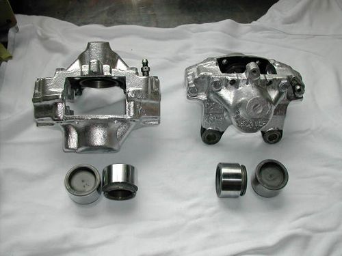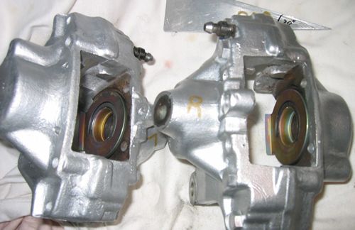 意外と簡単に安くヤフオでゲットしたR129('92)からの外し中古品 左:買った時の状態>これじゃ安いですよね。 右:分解したらピストンの状態も良くラッキー。念入りに洗い脱脂後重要部分にマスキングしてから塗装をした。 |