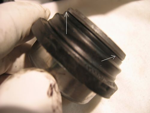 ダストシールのピストンにはまる部分にはラバーグリスを薄く塗布 矢印のところはしっかりとミゾにはめ込む |