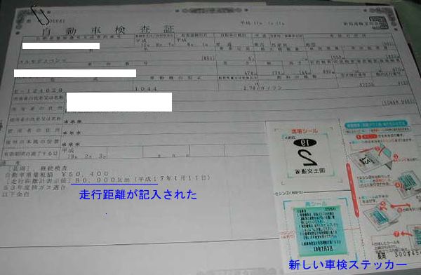 合格後交付された車検証(走行距離が記入された)と小さくなったステッカー |