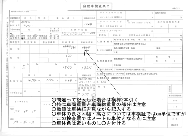 検査表2(裏面) ここは車検証を見ながら記入する。空欄も多いが気にしない。 |