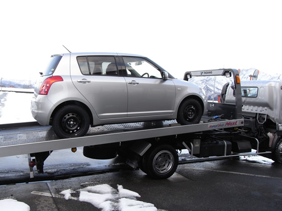 サビ止め塗装のため一度も走らない(納車されてからガレージで)うちにキャリアカーで運ばれていきます。 |