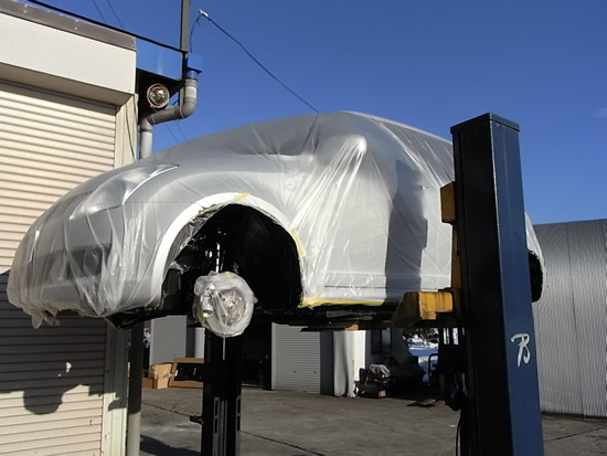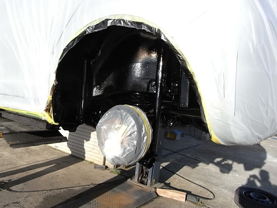 タイヤやサイドシルカバーなどは外して塗装。 |