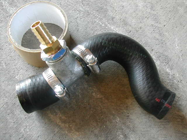 以前交換した時の廃物利用でラジエターホースを途中でカット。3/4インチ配管用T字型に水道ホースを付けられるように取り付け。費用約¥800