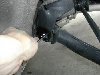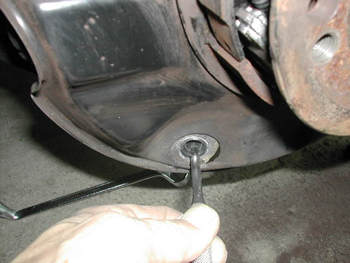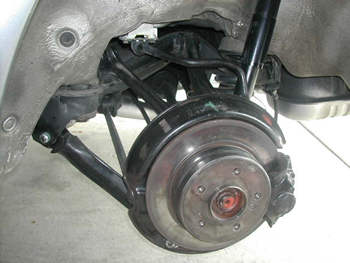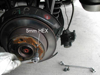 ブレーキキャリパー外し針金で釣っておく。 5mmのin-hex外します。締め付けは10Nm このボルトは新しい物に交換。 |