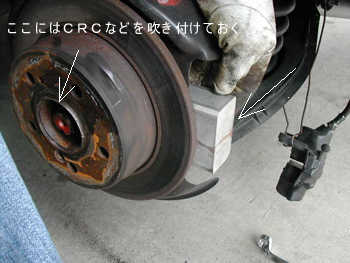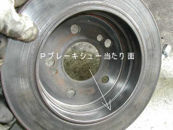 ここでPブレーキシューの点検。ローターの内側には大量のカスが・・・ シューの暑さは十分残っています。表面をサンドペーパーでサッと磨きました。ダストが溜まっていますがエアーガンで吹くと体に悪いので水で洗い流したほうがいいようです。 Aのナット19mm Bのナット17mmを外す。(CRCなどを吹いておく) |