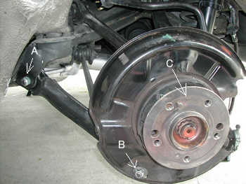 スラストアームのナット(A.B共に)はリプレイスしましたがAの新しいナットは18mmでした!Bは17mm A締め付けトルク70Nm Bは45Nm Cの面もワイヤーブラシでサビを落としました。これでローター、ホイールも正確に密着するので回転精度もいいでしょう。 |