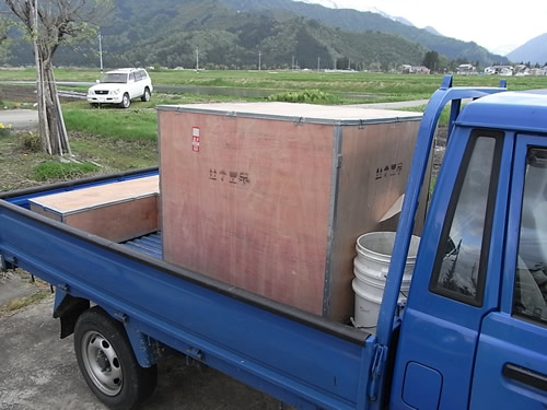 1.5tトラックにフォークリフトで積み自宅へ到着後フォークリフトでおろしました。