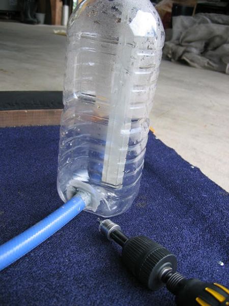 水道用散水ホースは外径19mmほどですので18mmのホルソーで穴を空け むりやり差込シーラントを塗布し水漏れ防止とした。 中に入れる水に水彩絵の具やLLCで着色するのもいいと思います。 |