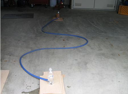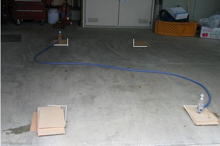 ホイールアライメント調整作業の前にタイロッド・ドラックリンクなどのガタを確認し 念のためFハブベアリングのクリアランスもダイアルゲージ使い調整しました。 タイヤの空気圧は4本共に230kpsに調整。 ガレージの床を水平に タイヤの接地面に印を付けたらクルマを動かしペットボトルに穴を空け水道ホースつなげて水を入れベニヤ板を敷きながらレベルを合わせた これに使用したベニヤ板はt=4mm 1820mmX910mm の物を250X350mmほどにカットして16枚使いました。t=4mmの合板はカッターで切れるので簡単です。 |