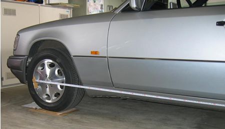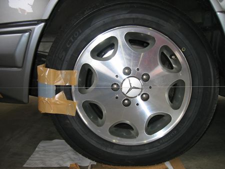 #フェンダーからオモリをホイルセンターに下げ垂直線を作って計測。地面近くまでオモリを下げホイールとの上下距離を測ることによってキャンバー計測が可能です。 |