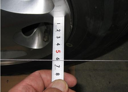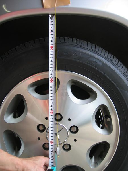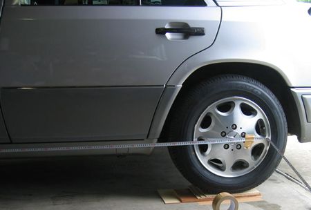 次に車高を計る この時はトランクに荷物なしスペアタイヤのみ・ガソリンは1/2・という状態でした。 ホイルセンターからフェンダーアーチ上端までの距離 左フロント387mm 右フロント384mm 左リア 376mm 右リア 376mm