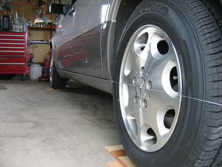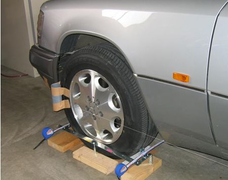 こんな風に4箇所 2人でペットボトルに貼り付けた定規のメモリを読めば効率いいですね。 フロントタイヤ下には薄い鉄板2枚敷いて 間にグリスを塗っておいた。(ステアリングが軽く切れるように) これは「toshspaさんのブログ」からアイディアを拝借しました。どうもありがとうございます。 |