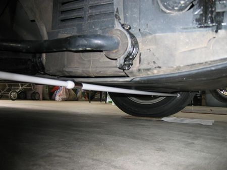 sr188さんのアドバイスどおり「つっぱり棒¥800」でフロントタイヤ前端にテンションをかけた。(いろんな所にあるブッシュのコンプライアンスを除去するにのに有効) |