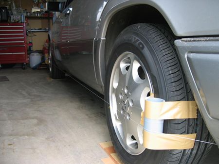 次はフロントトーインの計測 ホイルセンターに車体を一周するよう太さ0.5mmの糸を張った 自動車にはどこを探しても垂直な線や水平な線がありませんがホイルセンターに糸を張ることにより水平に近い線が作り出せることが解り、これを使えばさまざまな部分の数値を読み取ることが出来るんですね! |