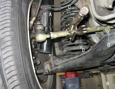 左フロントのタイロッド調整。Aのロックナットを緩めBも緩めれば調整可能。 C方向でトーイン減少。D方向が増加(今回はコッチ回しです) Aは2面幅22mm 50Nm Bは2面幅13mm 20Nmの締め付けで |