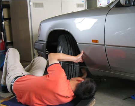 タイロッド調整中の私。(家内撮影) Fタイヤの下にグリスを塗った鉄板敷いてあるのでタイヤが簡単に動き作業がしやすいです。 |