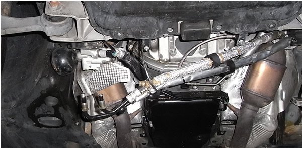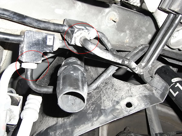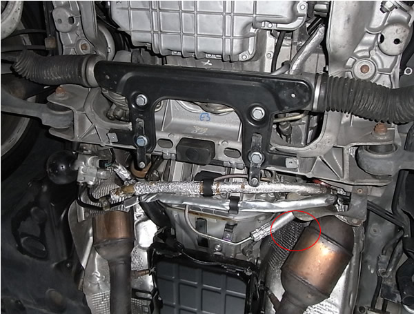 上画像の赤丸上のあたりです。よく観察するとABCホースは触媒からヒートシールド使い守っていますがパワステホースは触媒とヒートシールドの間を通り熱害をモロに受けています。