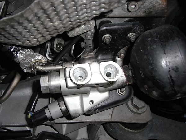 右側のアキュムレターがあるところから配管を外した。オイルが勢いよく吹き出るかと思ったが、ちょっとたれただけでした。