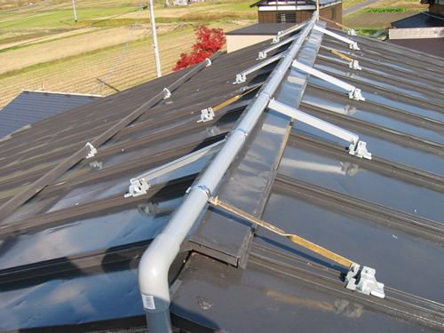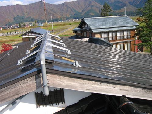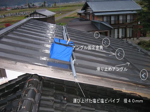 2006年秋 ○で囲ってある滑り止めアングル固定金具を利用して屋根の尾根に塩ビパイプを固定して地下水を噴水のように出すという作戦。 画像手前部分の瓦屋根は従来どおり雪下ろしが必要ですが面積は(雪下ろし所要時間)は半分になりました。 |
